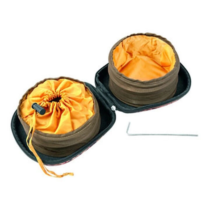 When open, two separate spring-loaded bowls pop up. Both bowls are removable and secured with Velcro®. The food bowl also includes a drawstring closure to carry food. You can use it with ease out in the field with a metal stake that secures the bowls to the ground.